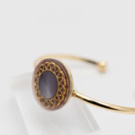 日常のふとした瞬間に、そっと手元を彩る、特別な輝きを求めていませんか? 光を浴びて煌めくノーブルパープルの繊細なメダリオンは、まるで時を超えたアンティークのように、あなたの指先に上品な物語を紡ぎます。洗練された大人のお洒落を、このバングルで心ゆくまでお愉しみください。