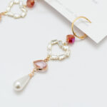 肌に溶け込むような淡いピンクのストーンが柔らかな彩りを添え、一番下で揺れる涙型のパールが、クラシカルな品格と高見え感を演出。異なる素材と色合いが耳元で奏でるハーモニーは、まるで小さなアートのよう。