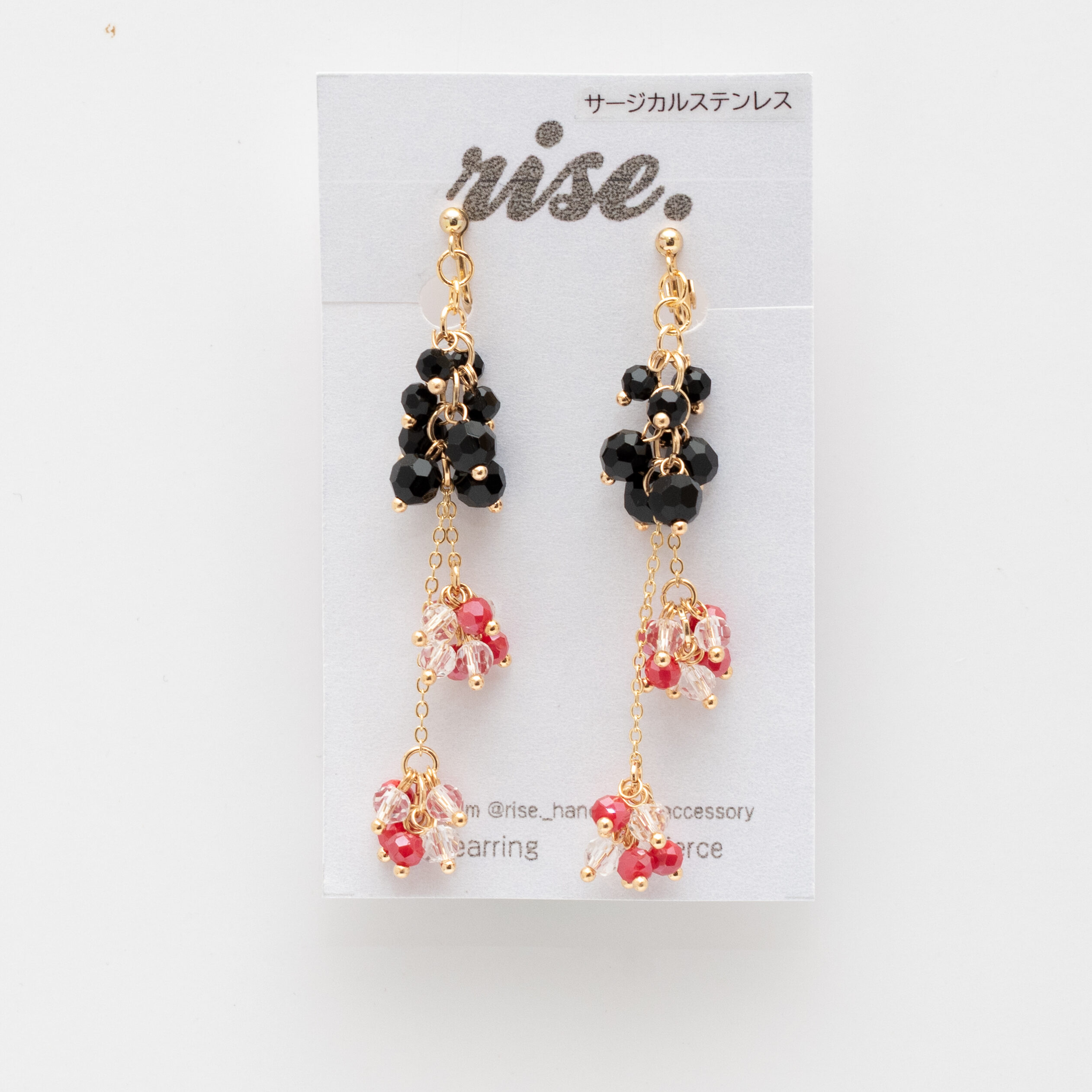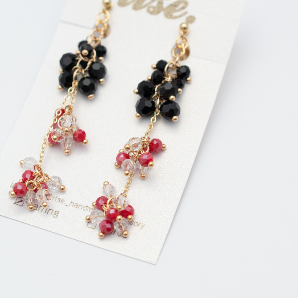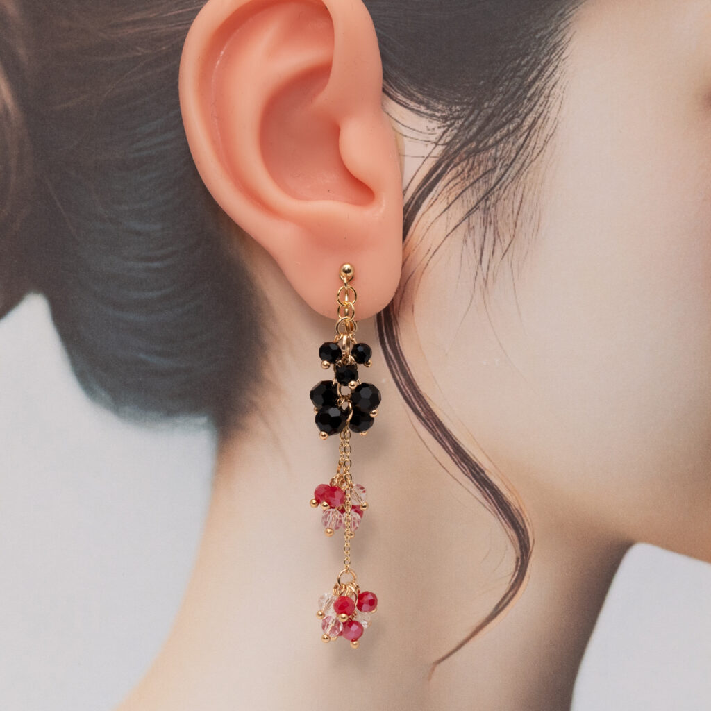 耳元でそっと揺れる、この小さな輝きが、あなたの心に魔法をかけます。深みのあるレッドとシックなブラックが織りなすコントラストは、まるで光の粒が降り注ぐシャワーのよう。五感を刺激するそのデザインは、日常に華やぎを、特別な日には自信を贈るでしょう。