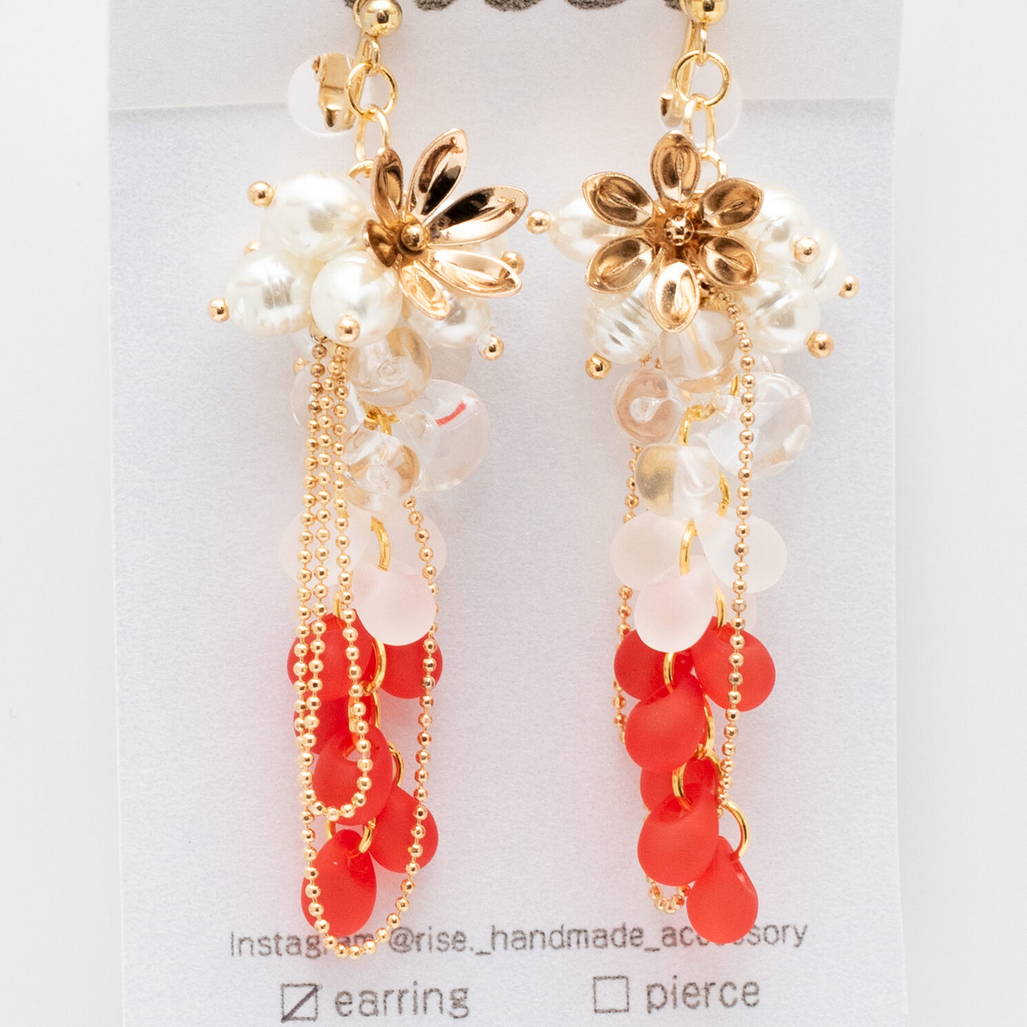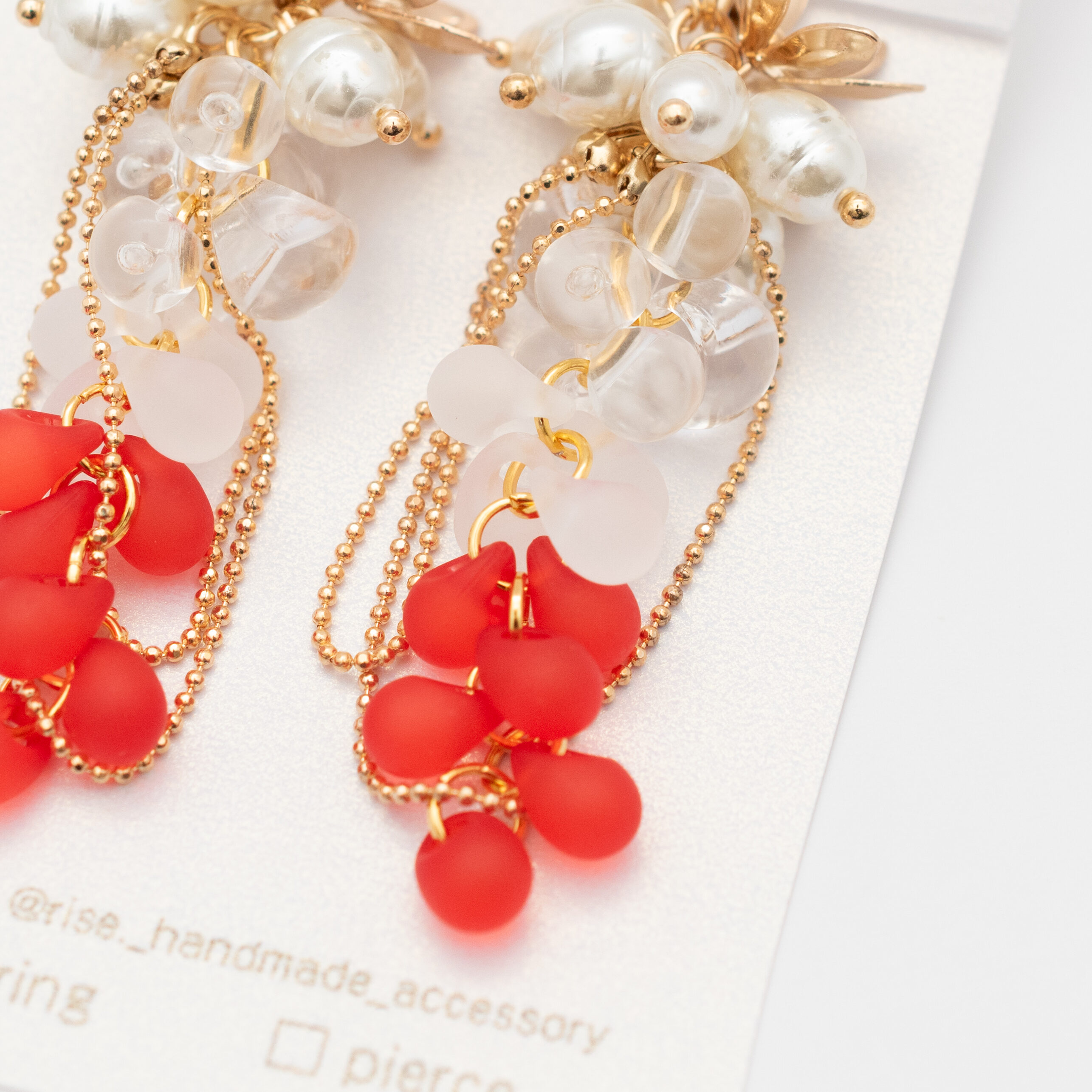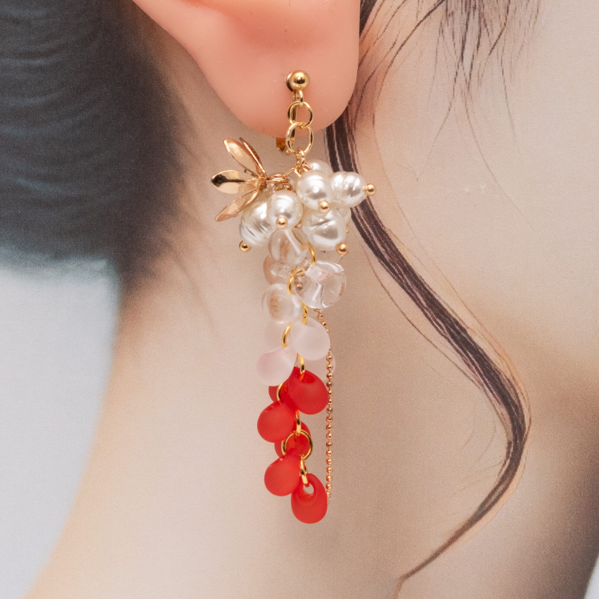 マットな質感の紅い雫は、まるでたわわに実った果実のよう。不揃いな形のパールやゴールドの花びらのようなメタルパーツ、そして透明感あるクリアビーズが、動きに合わせて繊細にきらめき、見る角度で様々な表情を見せてくれます。