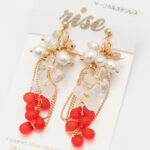 マットな質感の紅い雫は、まるでたわわに実った果実のよう。不揃いな形のパールやゴールドの花びらのようなメタルパーツ、そして透明感あるクリアビーズが、動きに合わせて繊細にきらめき、見る角度で様々な表情を見せてくれます。