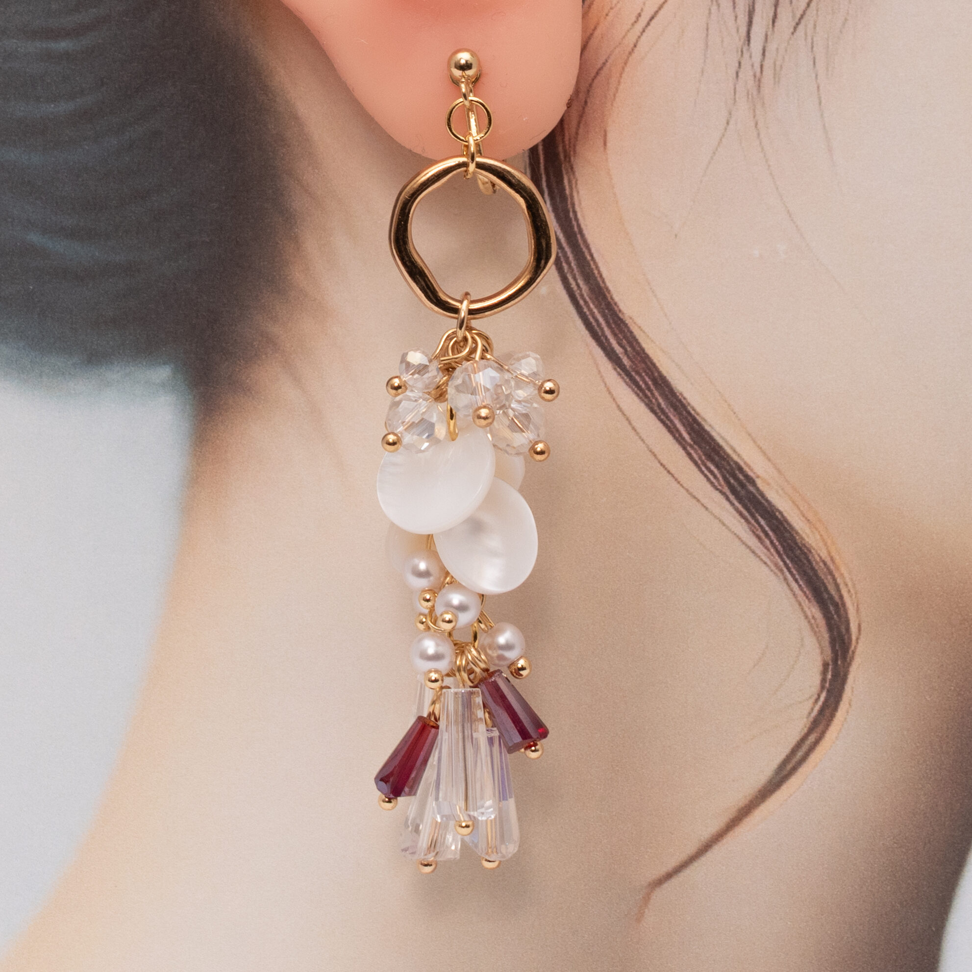 クリアなカットガラスビーズが光を繊細に捉え、深みのあるボルドーカラーのカットガラスビーズが、大人の情熱と落ち着きを耳元に宿します。動くたびにキラキラとまばゆい光のシャワーを放ち、まるで小さな花束が咲き誇るかのよう。