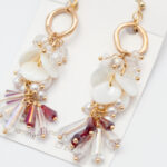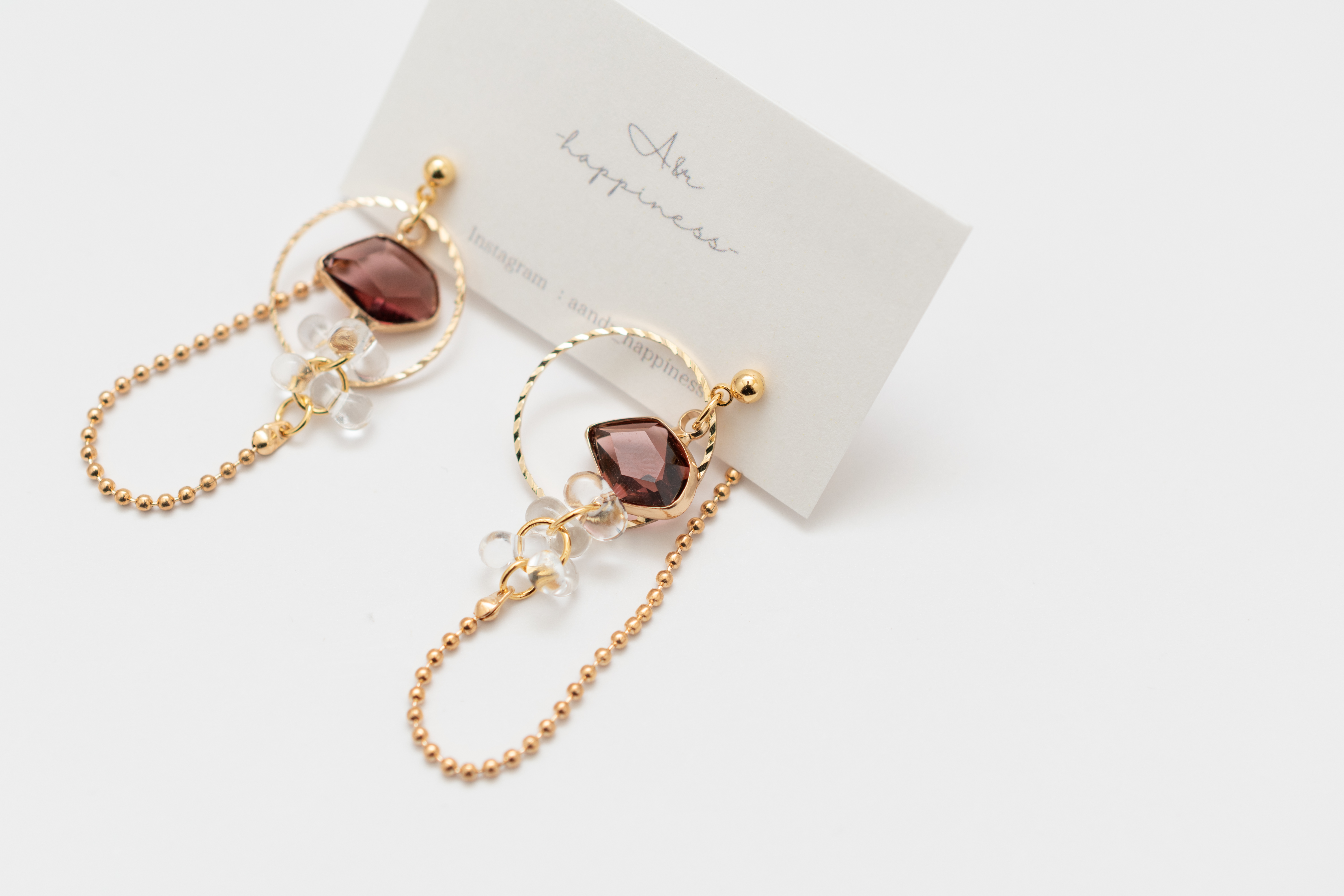 クリアなカットガラスビーズが光を繊細に捉え、深みのあるボルドーカラーのカットガラスビーズが、大人の情熱と落ち着きを耳元に宿します。動くたびにキラキラとまばゆい光のシャワーを放ち、まるで小さな花束が咲き誇るかのよう。