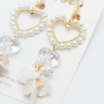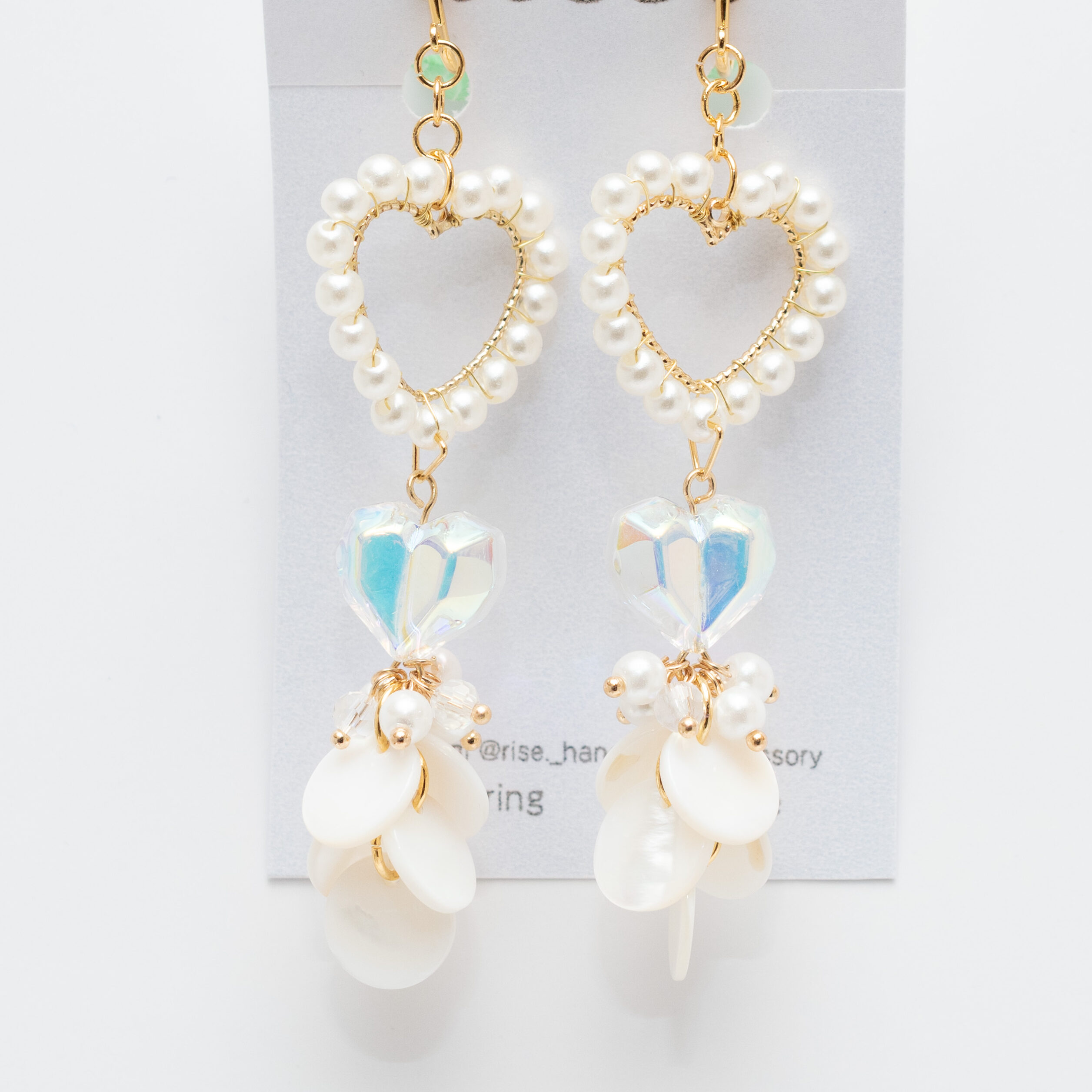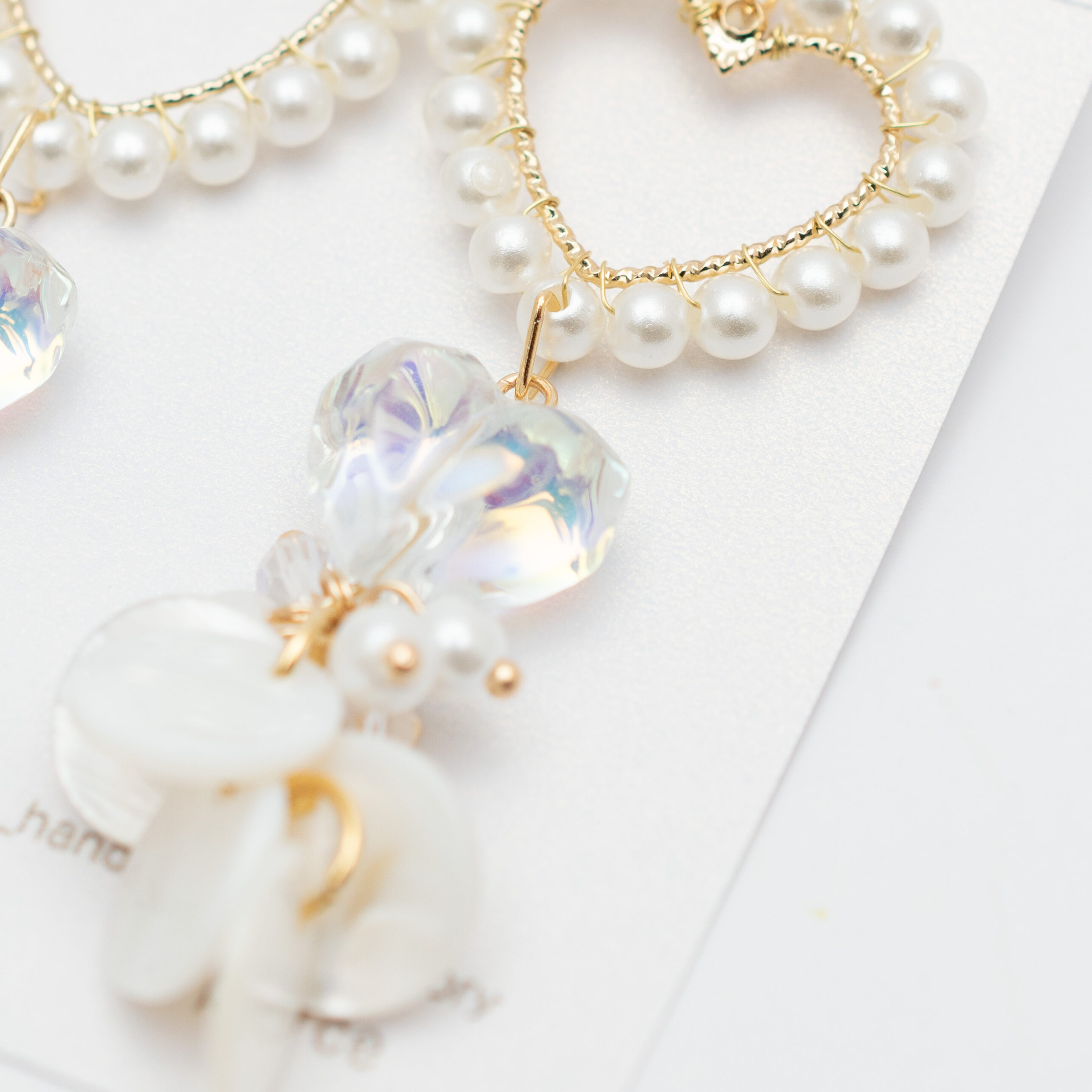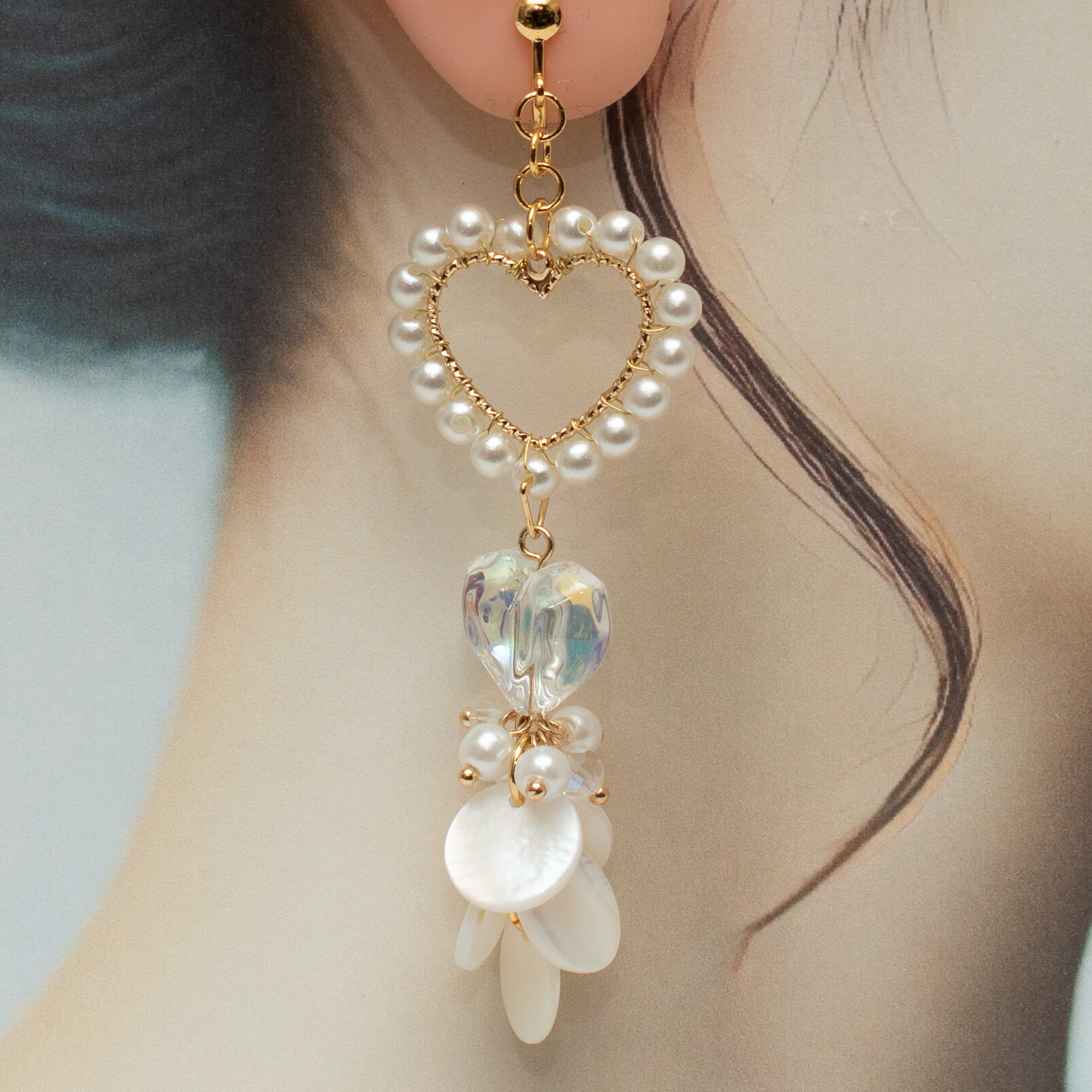 きらめくゴールドのハートモチーフには、小粒パールが上品な輝きを添え、大人の可愛らしさを演出します。中央でぷっくりと輝くオーロラハートクリスタルは、光の角度で虹色にきらめき、幻想的な表情を見せます。その下で軽やかに揺れるのは、天然素材ならではの柔らかな光沢を放つパールシェル。海辺のきらめきを思わせる繊細なハーモニーが、顔周りを涼やかに、そして華やかに彩ります。