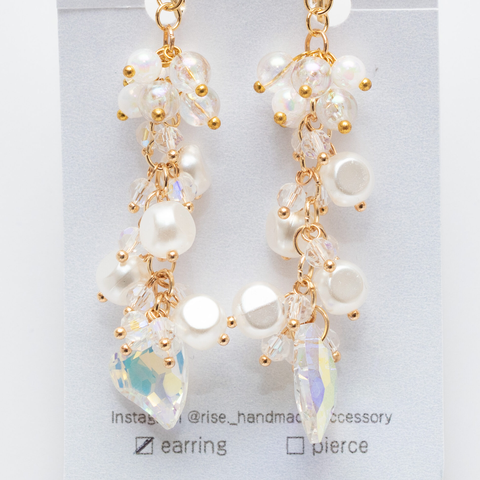 耳元でそっと揺れる度、オーロラ加工の雫型パーツが七色の光を放ち、パールの柔らかな輝きと相まって、まるで「光のシャワー」を浴びるよう。繊細なドロップデザインが、顔周りをぱっと明るく、華やかに彩ります。肌に優しいサージカルステンレスを使用しているため、敏感肌の方も安心。軽量で一日中快適にお過ごしいただけます。