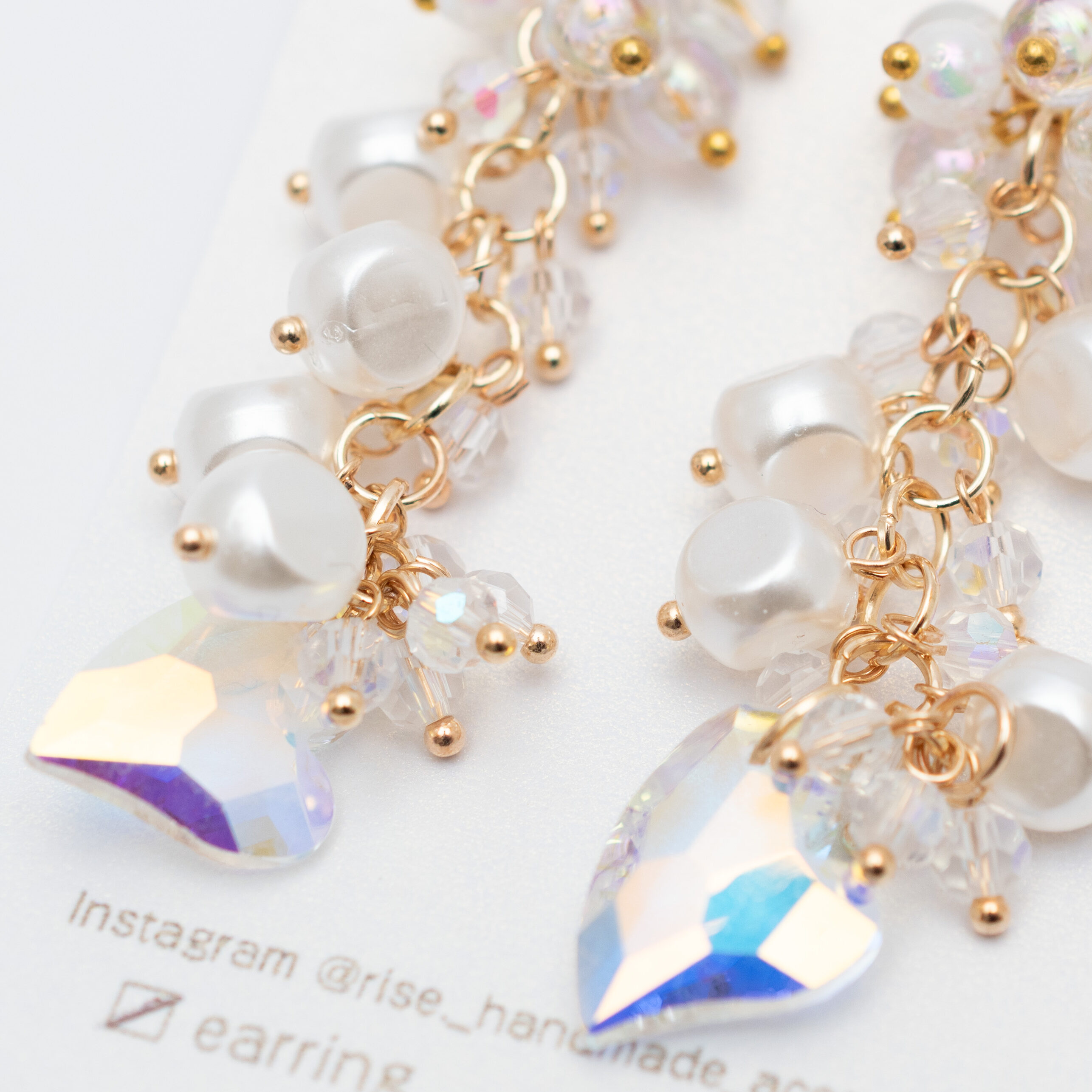 『フェイクパールとオーロラハートのイヤリング』は、光を浴びて七色に煌めくオーロラと、柔らかなパールが織りなす、夢のような輝きが魅力。顔周りをぱっと華やかに彩り、見るたびに心がときめくはずです。