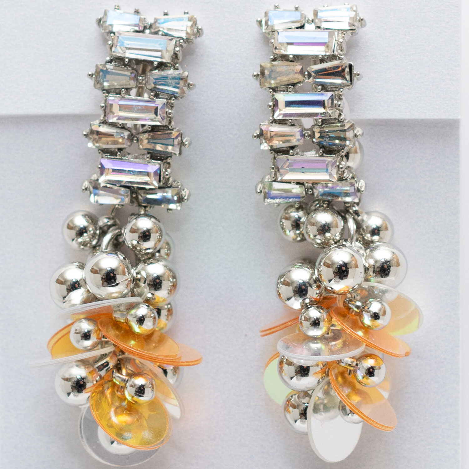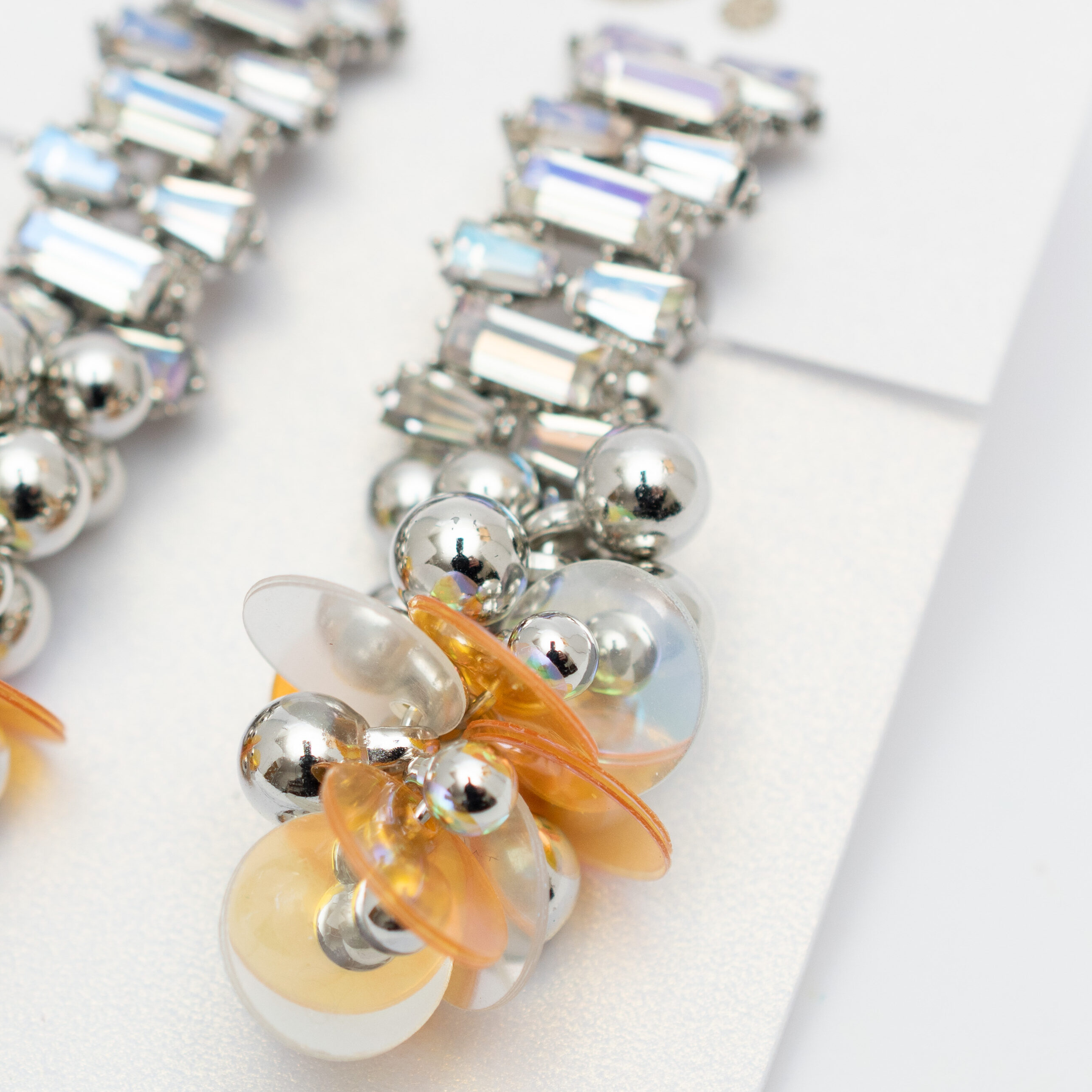 上部には、光の角度で七色のオーロラを放つバゲットビーズが揺れ、都会的で洗練された印象を演出します。その下には、大小のシルバーボールがシャワーのように連なり、鏡のような光沢でモダンな輝きをプラス。さらに、琥珀色の軽やかな花びらパーツが、作品全体に温もりと優雅な表情を与えます。