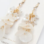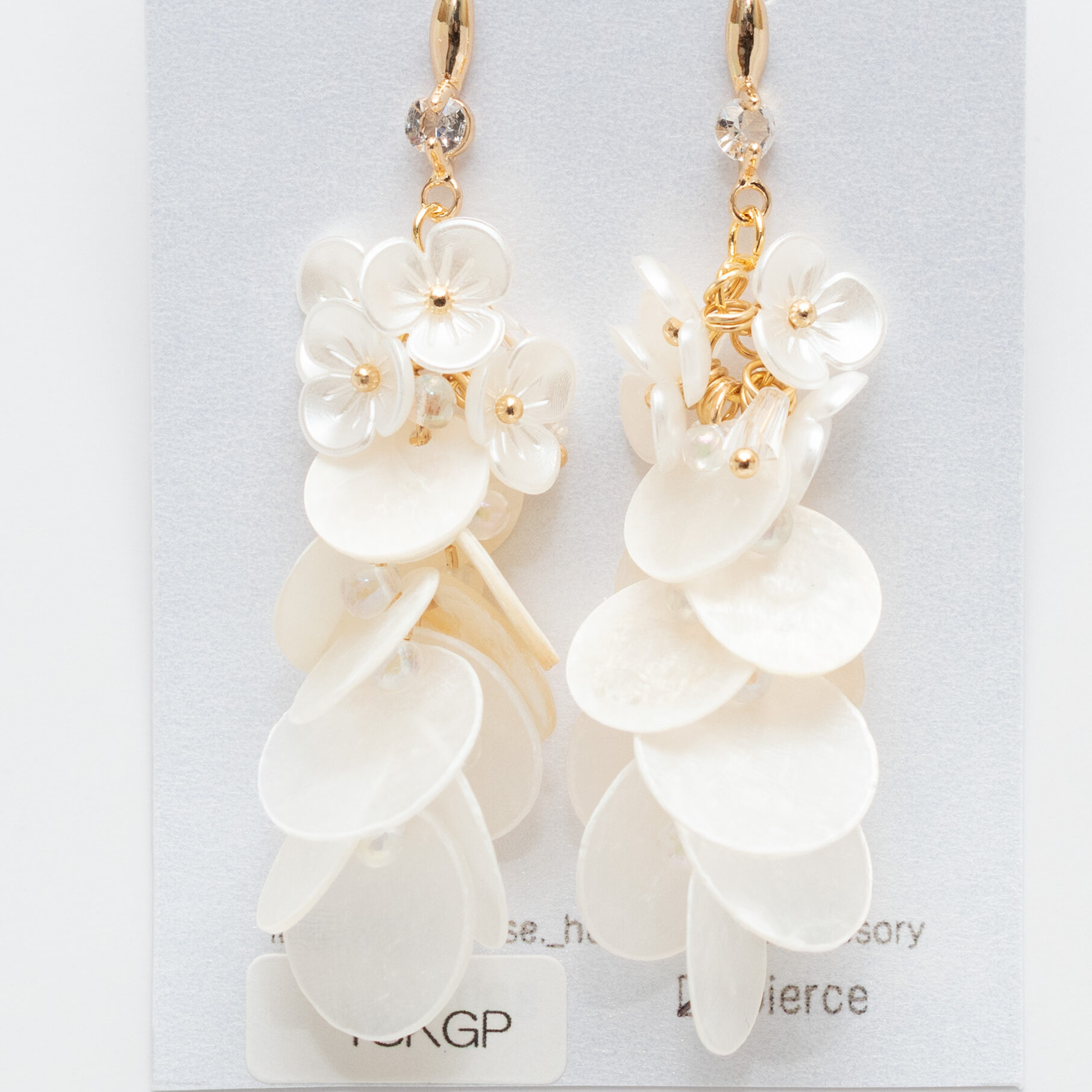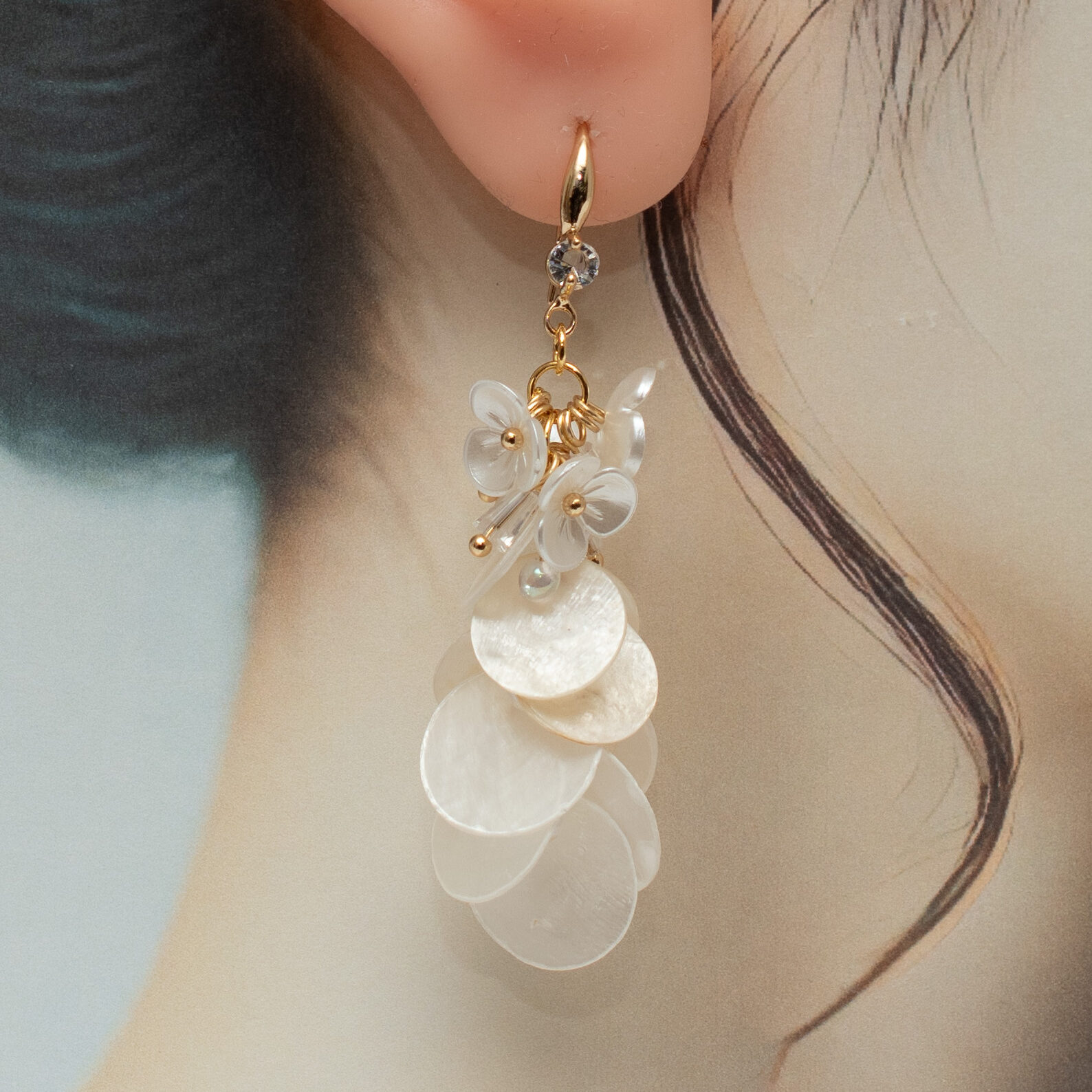 肌なじみの良いゴールドフックから揺れるのは、朝露のようにクリアな小花と、見る角度で表情を変える天然シェル。ホワイト、クリア、ゴールドの万能カラーは、春夏のシャツからカジュアルなデニム、結婚式の二次会やオフィスまで、どんなシーンにも自然と寄り添い、洗練された大人の魅力を引き立てます。