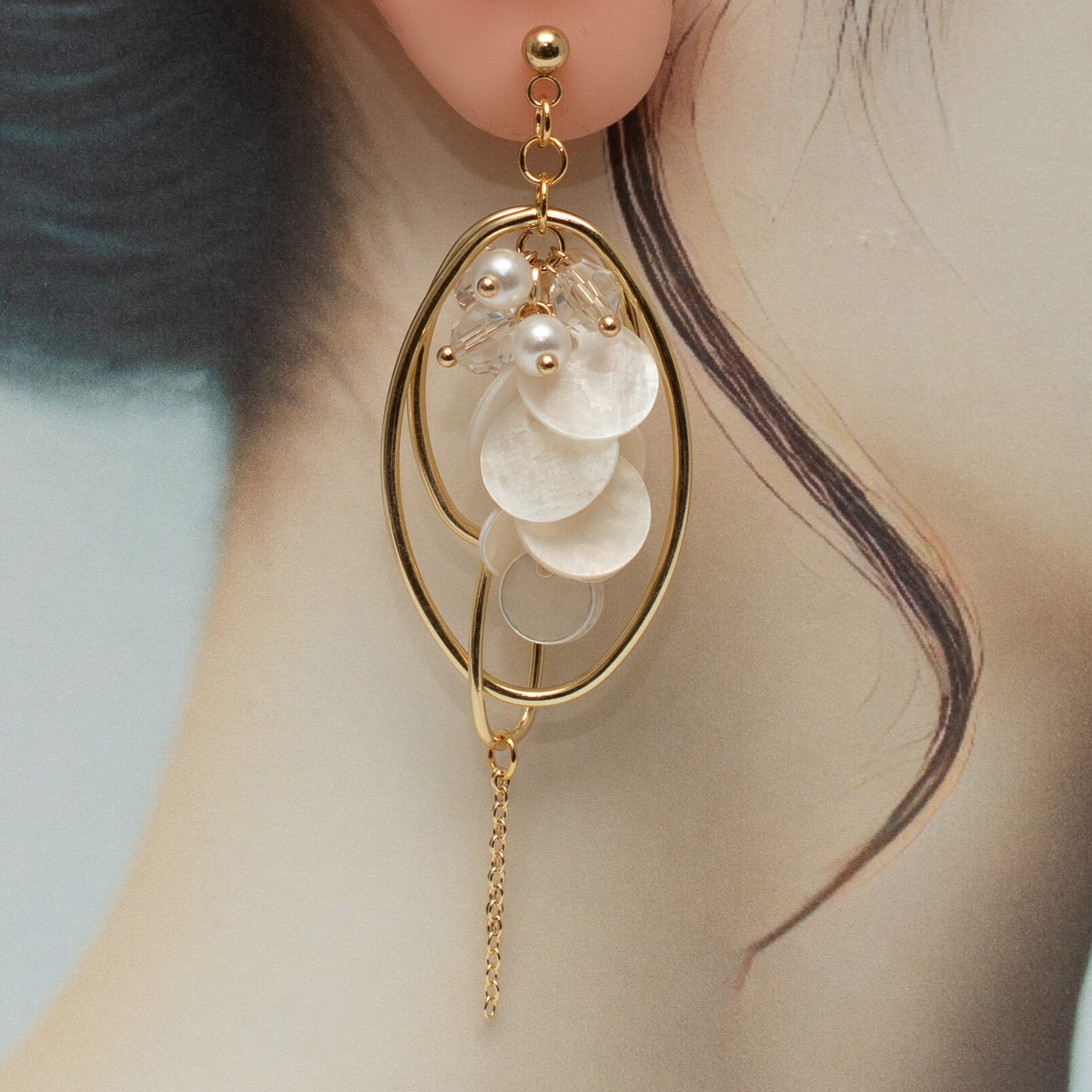 繊細なゴールドワイヤーとチェーンが織りなすデザインは、顔の輪郭をすっきりと見せ、洗練された印象を与えます。オフィスからカジュアル、友人とのランチまで、幅広いシーンで活躍し、大人の女性に特におすすめです。