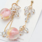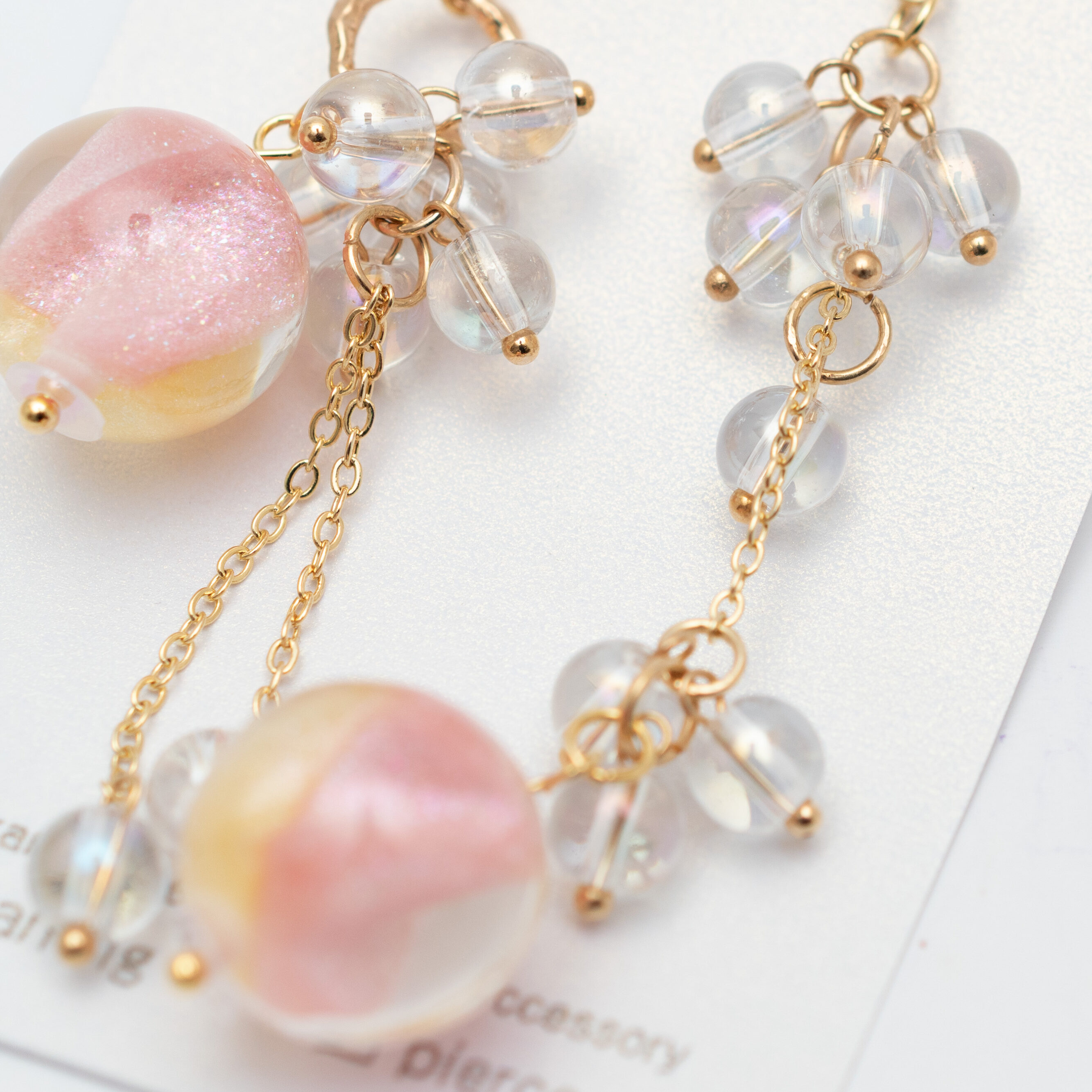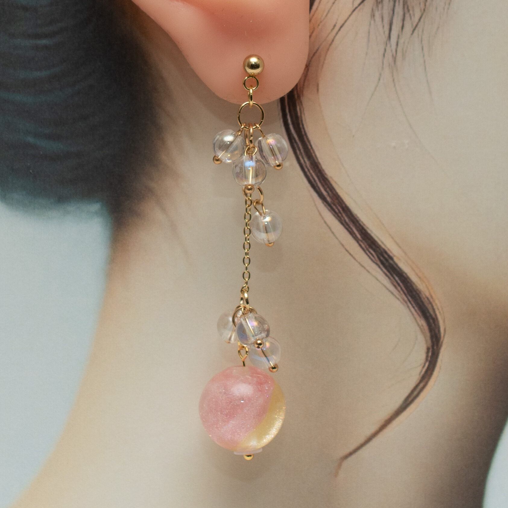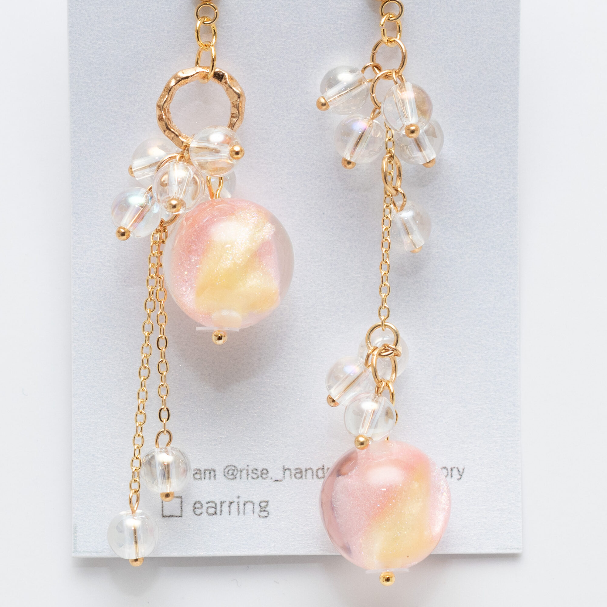 ピンクとイエローが美しくマーブル模様を描く大ぶりのドロップビーズは、光を受けるたび繊細に煌めき、見る角度で表情を変えるたびに心ときめかせます。アシンメトリーなデザインが顔周りに洗練された抜け感を演出し、揺れるたびに視線を引きつける魅力です。