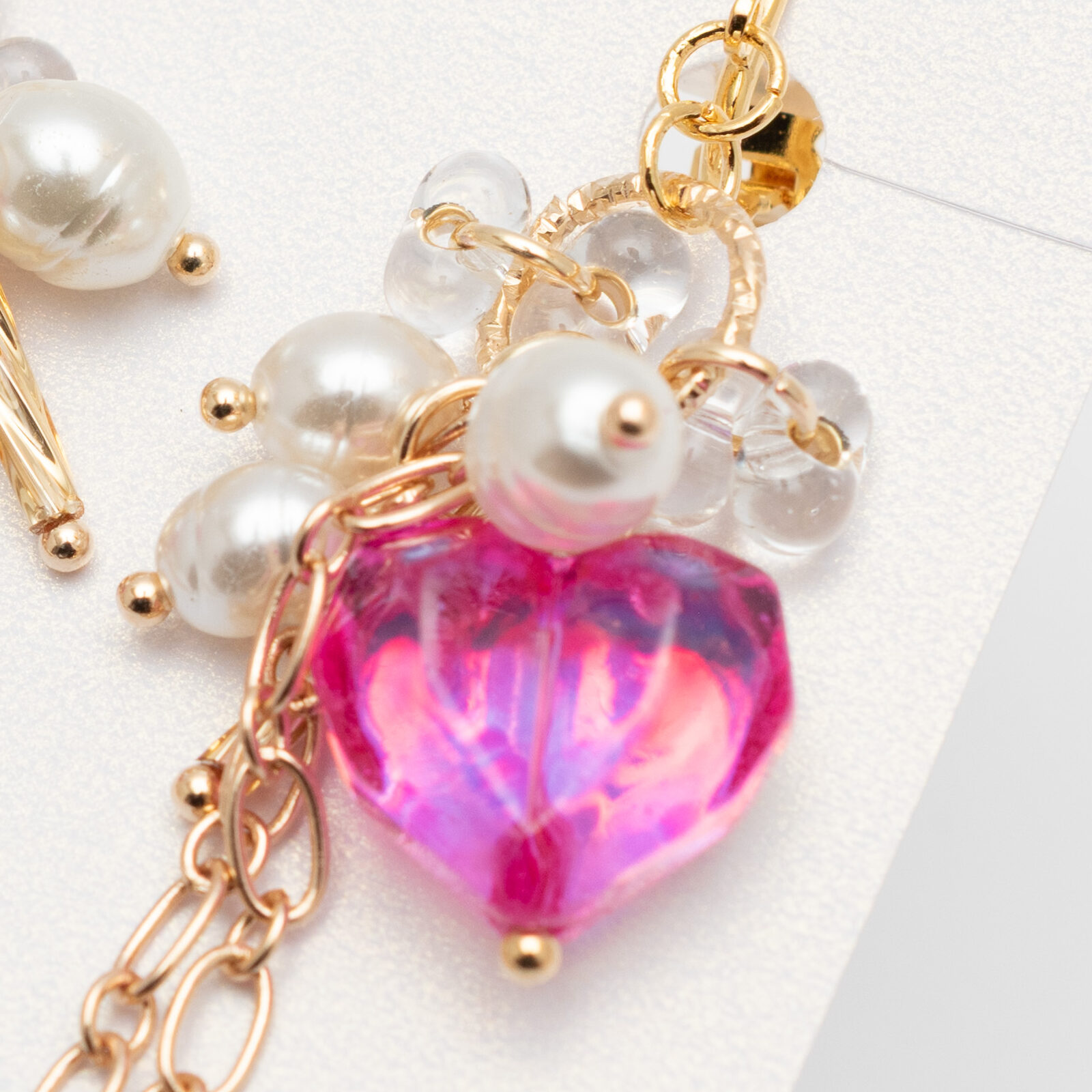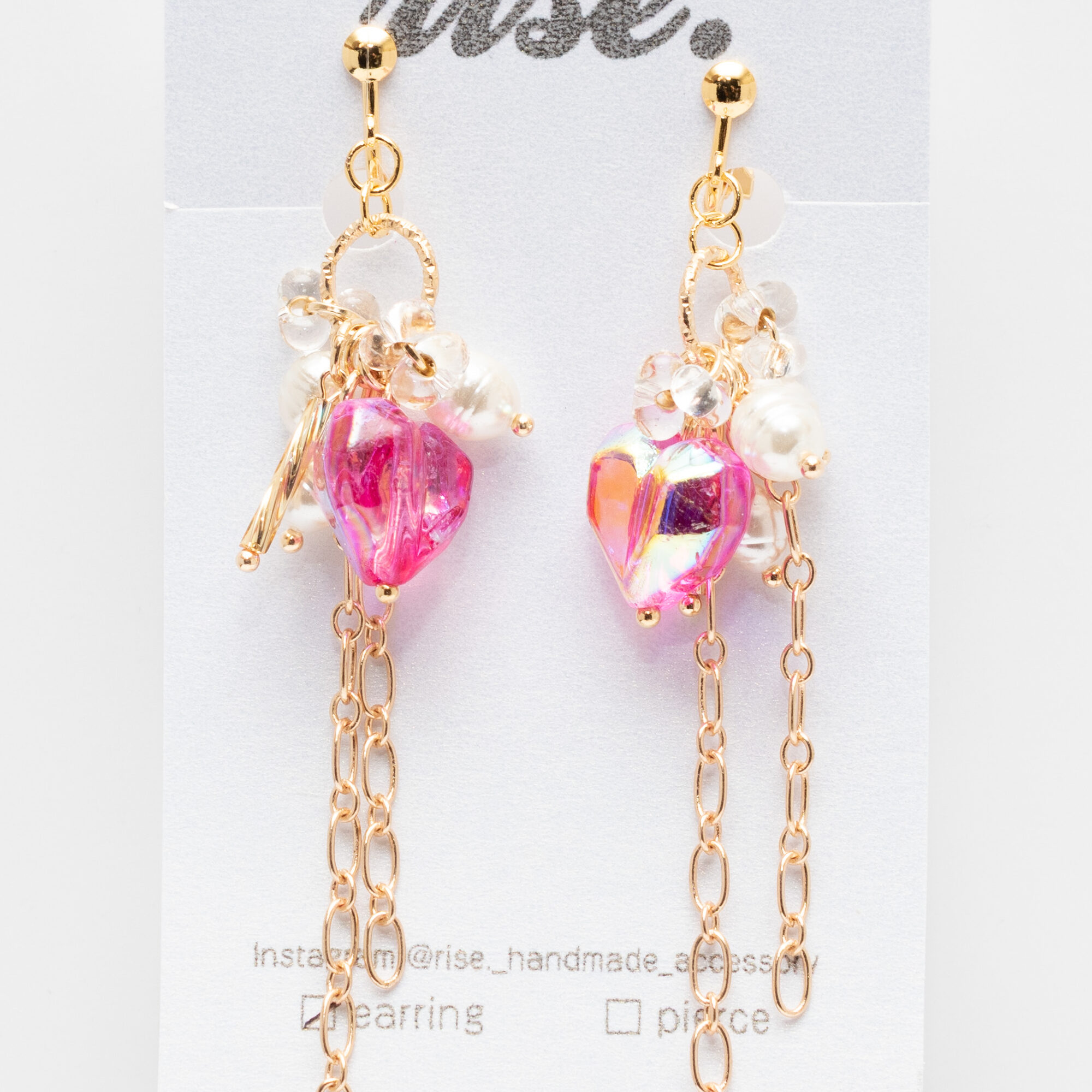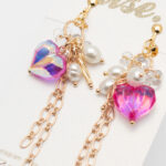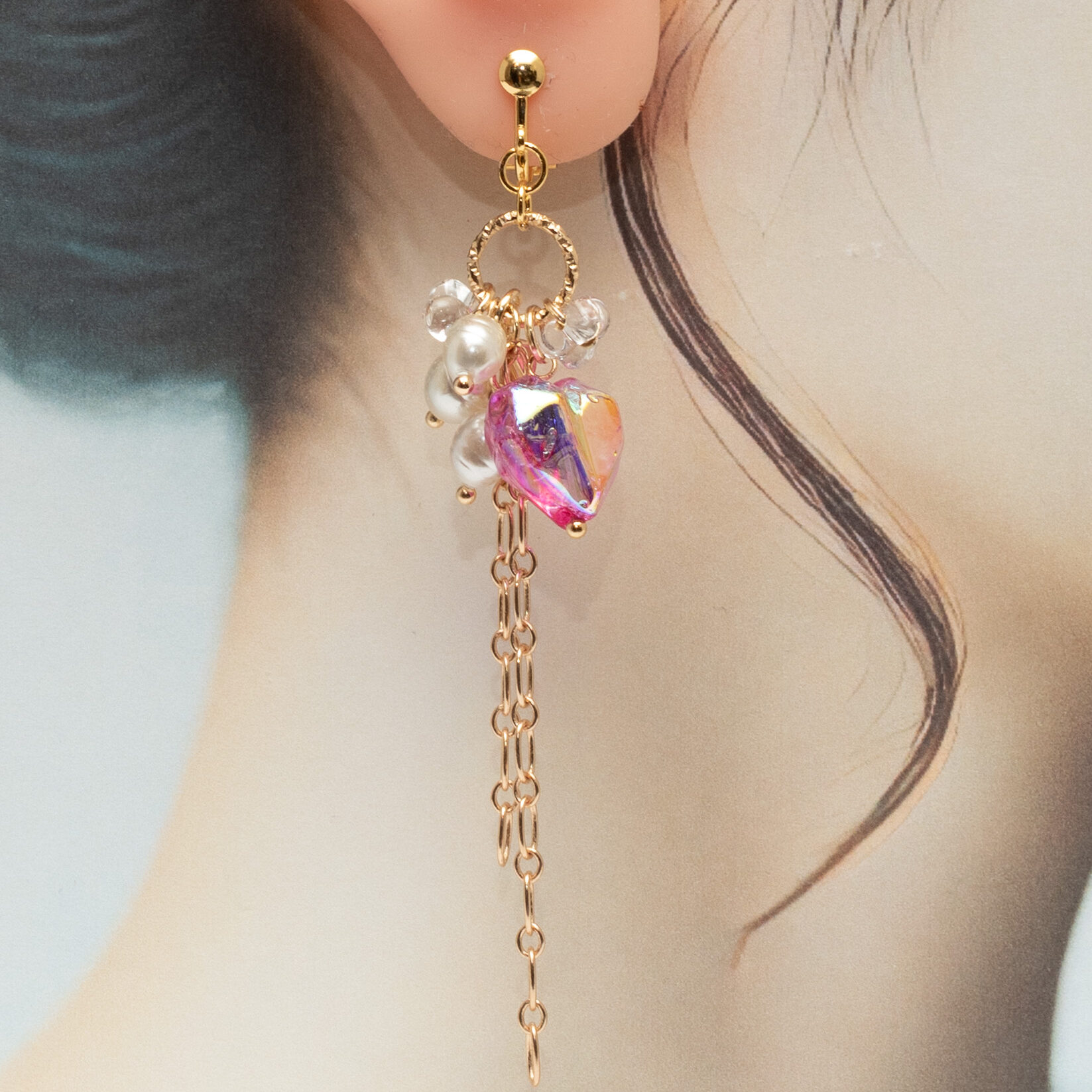 ピンクの変形ハートビーズが光を受けてオーロラのように輝く、華やかなイヤリング。 淡水パール風ビーズとゴールドチェーンの組み合わせが、上品さと可愛らしさを絶妙なバランスで演出します。 動くたびに揺れるロングチェーンが、横顔を美しく印象づけてくれるデザインです。