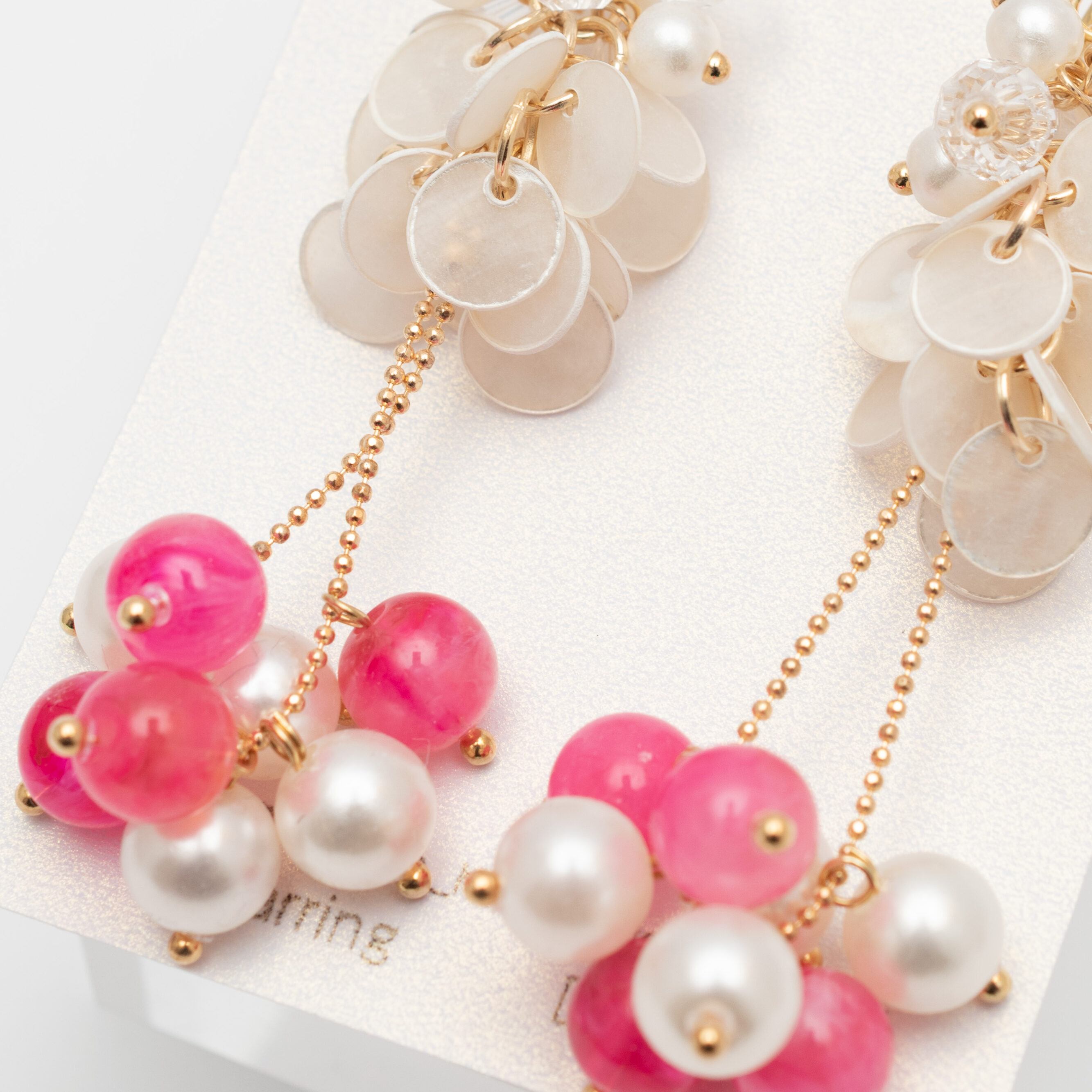 天然シェルチャームのやわらかな光沢と、華やかなピンクガラスビーズを組み合わせたイヤリング。上品なホワイト×ピンクの配色に、ゴールド金具の輝きが加わり、女性らしさを引き立てます。