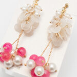 天然シェルチャームのやわらかな光沢と、華やかなピンクガラスビーズを組み合わせたイヤリング。上品なホワイト×ピンクの配色に、ゴールド金具の輝きが加わり、女性らしさを引き立てます。