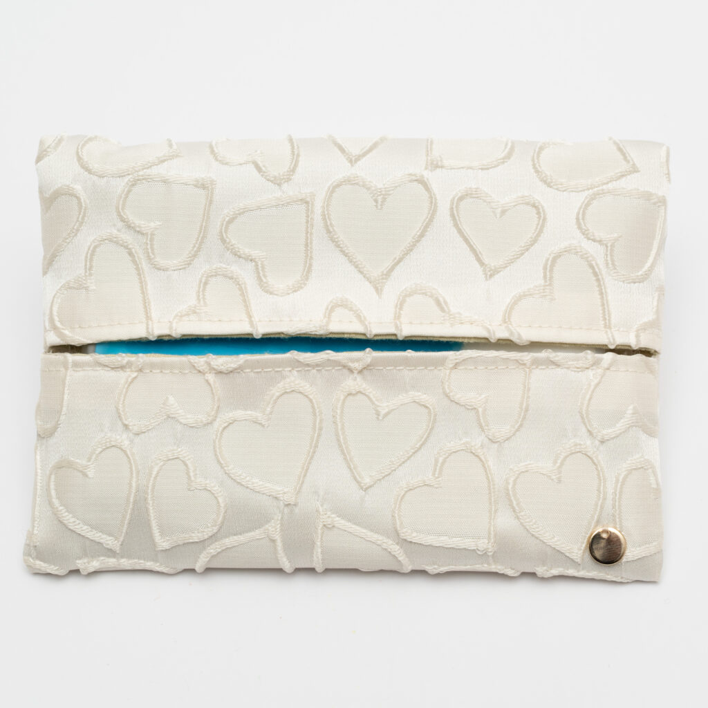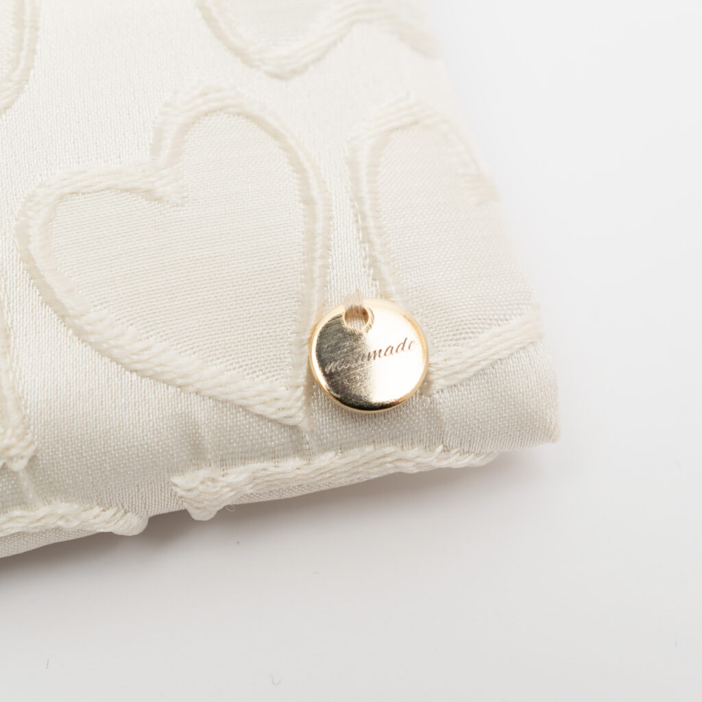 光沢感のある上品なホワイト生地に、同色のハート刺繍が可憐に浮かび上がるポケットティッシュケースです。真っ白なキャンバスに描かれたような立体的なハート模様が、清楚で華やかな印象を与えてくれます。右下に配されたゴールドのロゴチャーム(GDタグ)は、ホワイトとの相性が抜群で、大人の女性にふさわしい上質な華やぎを演出。持っているだけで背筋が少し伸びるような、清潔感と品格を兼ね備えた一品です。