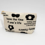 生成りのコットン地に、シックでモダンなモノクロの花模様。そして、遊び心を感じさせるランダムな英文ロゴ。この絶妙な組み合わせが、シンプルでありながら「洗練された高見え感」を漂わせます。さらに、生地の上質さと手作りの温もりが重なり、使うたびに特別感を与えてくれるのも魅力です。