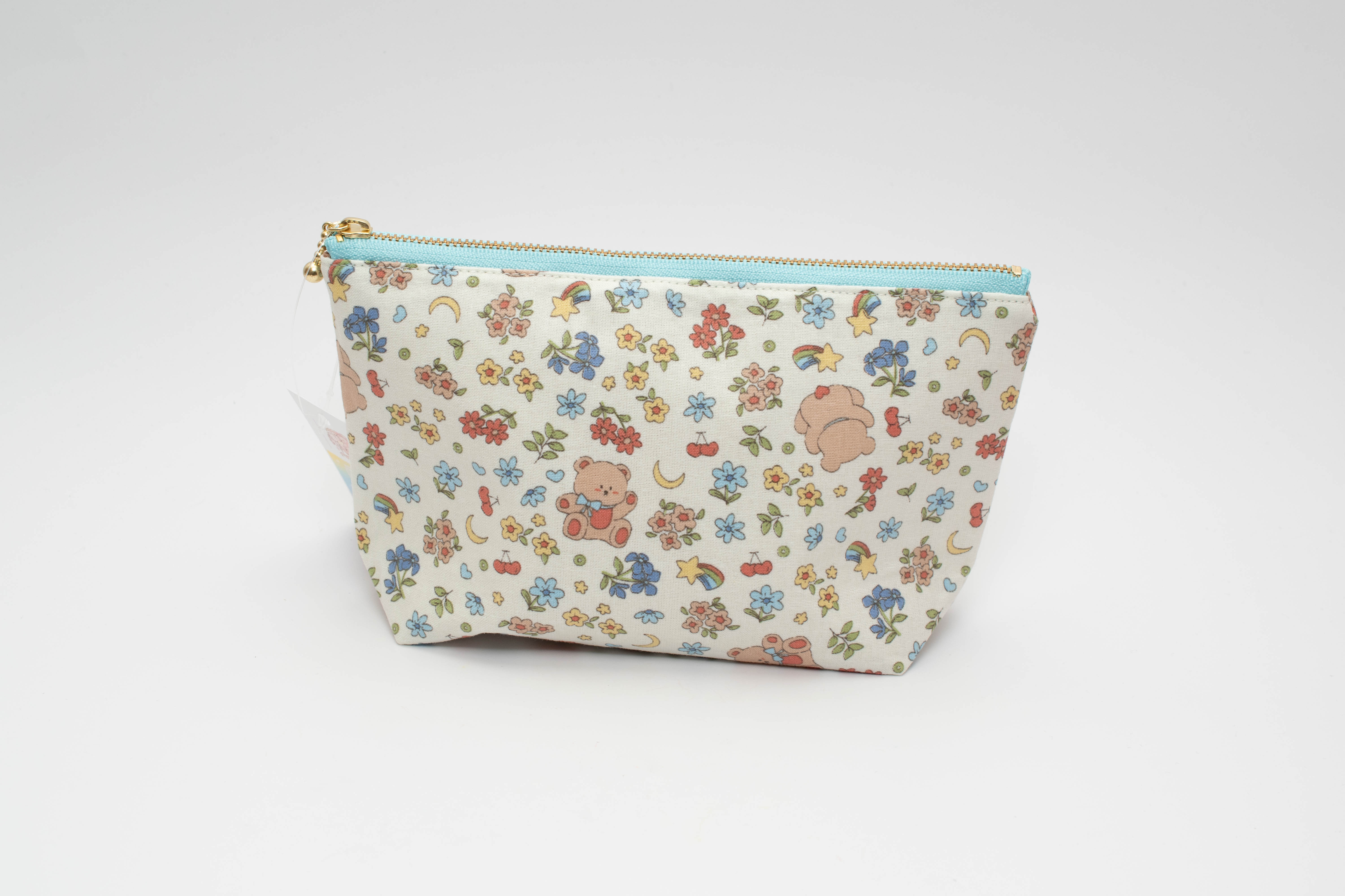 モノクロームの花模様と遊び心ある英文ロゴが出会ったひめもも様のポーチ。大人らしいシックさと、隠された可憐な小花柄の裏地。そのギャップが、日常に小さなときめきを運んでくれます。