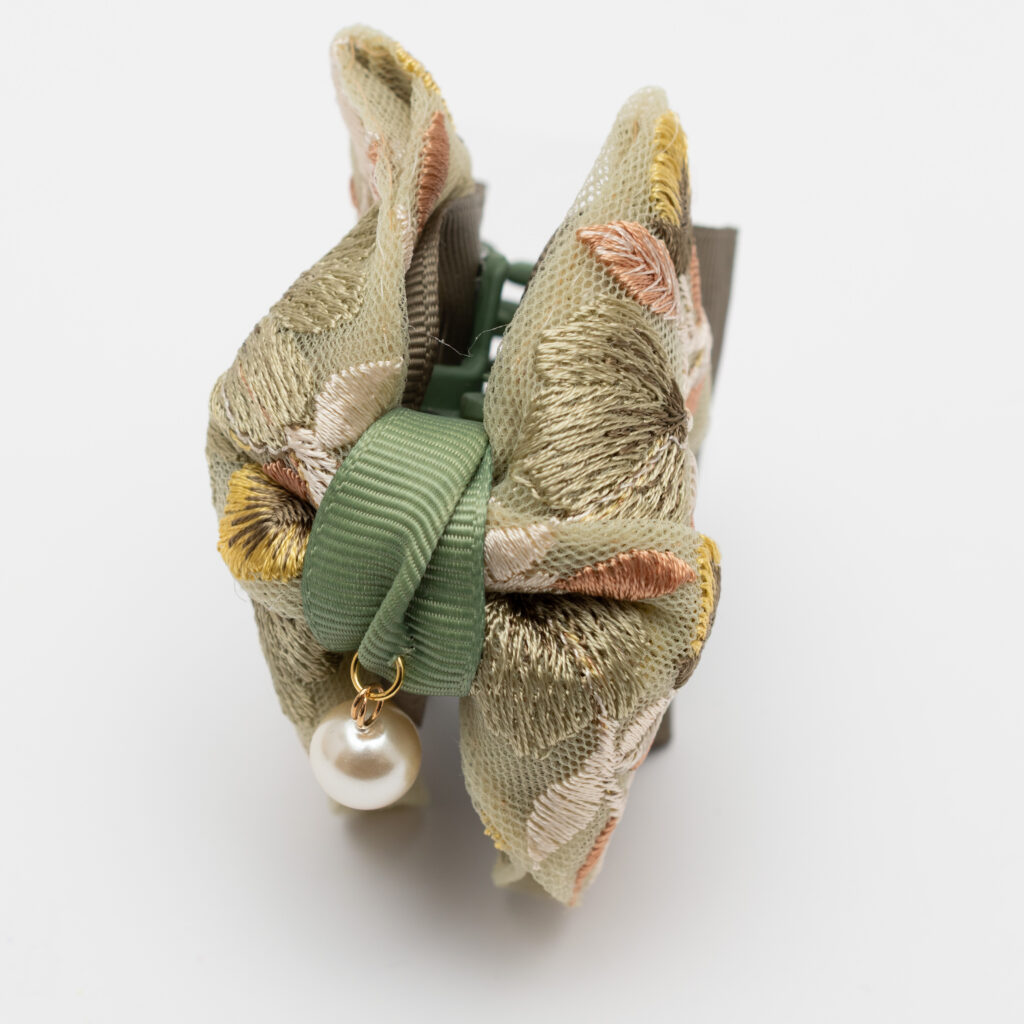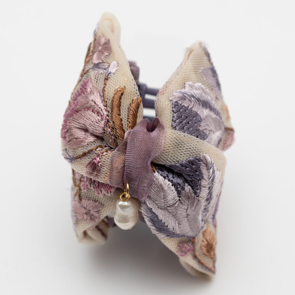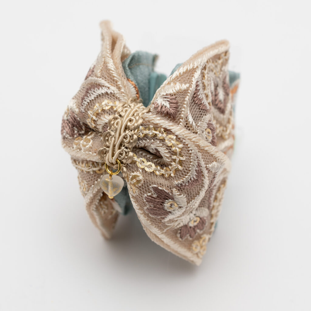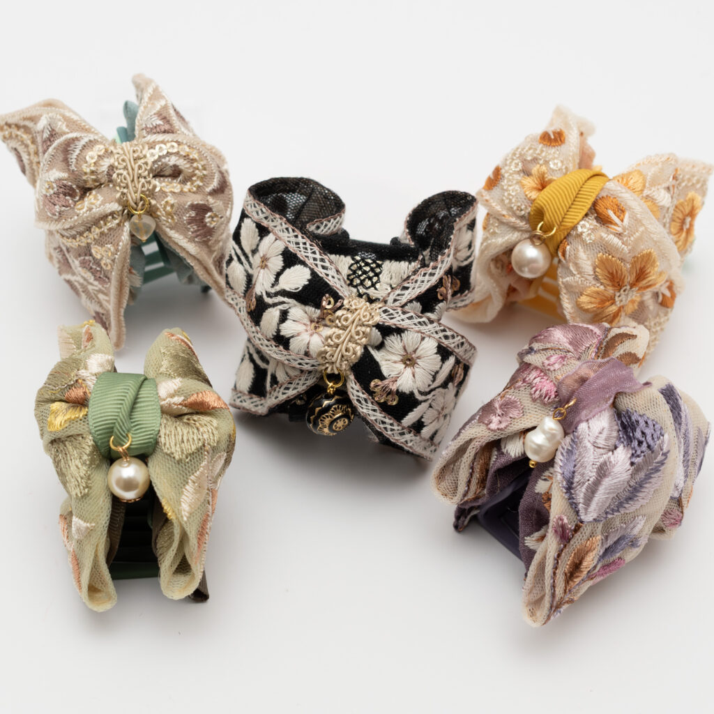 インド刺繍リボンのきらめきを、手のひらサイズのミニバンスクリップにぎゅっと閉じ込めました。髪をまとめるたび、刺繍の立体感とやさしい光沢がふわっと気分を上げてくれます。