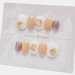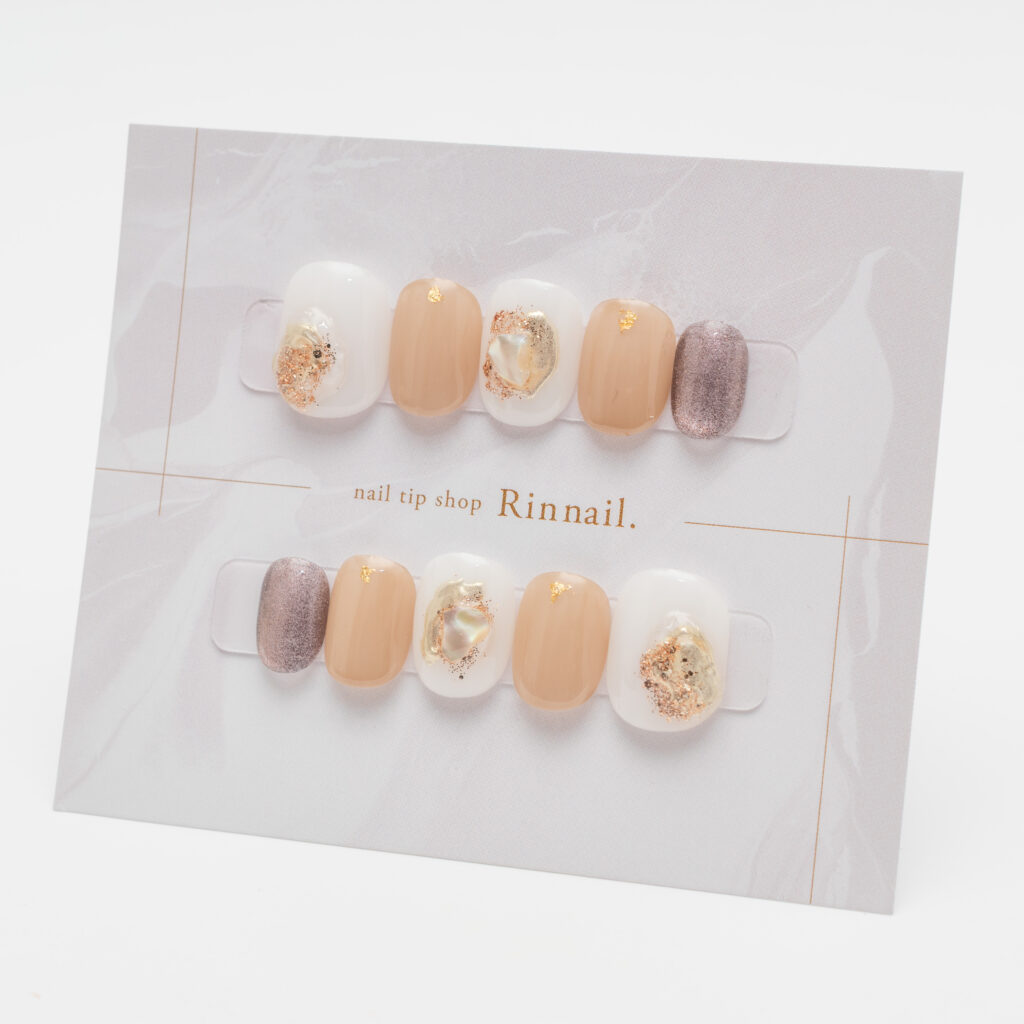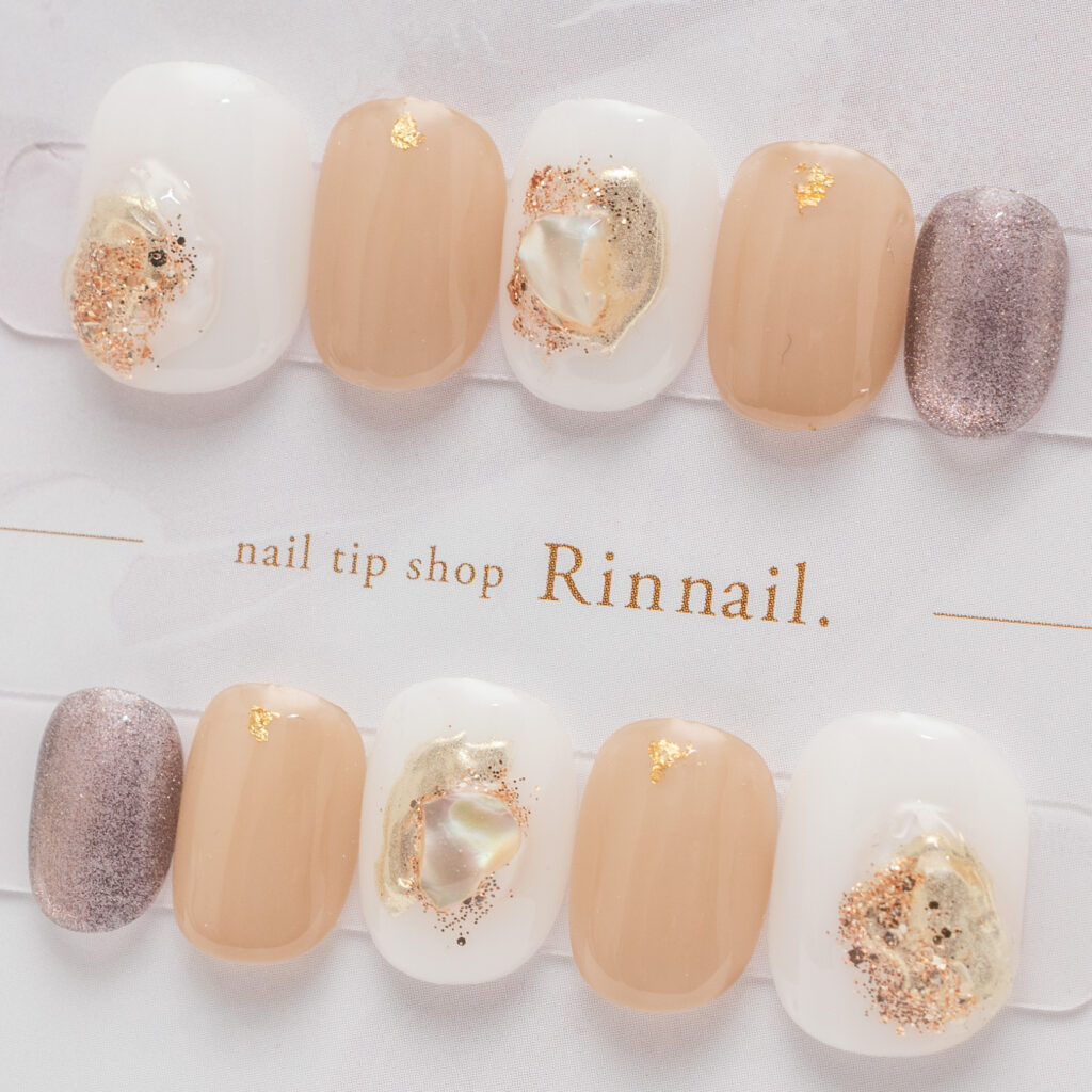 やわらかなミルキーホワイトとピーチベージュを基調に、ゴールド箔とシェルパーツをあしらった上品ネイルチップです。