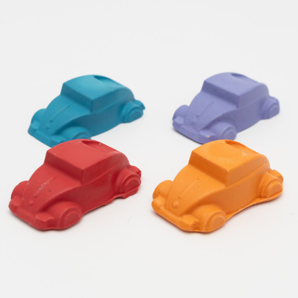 HOLO-HOLO custom crayon shopの様が、一つ一つ心を込めて手作りしたこのクレヨンは、小さなお子様の手にも優しくフィットする、愛らしい車の形が特徴です。赤、オレンジ、ターコイズブルー、ラベンダーパープルの4色は、鮮やかでありながら目に優しいマットな質感。