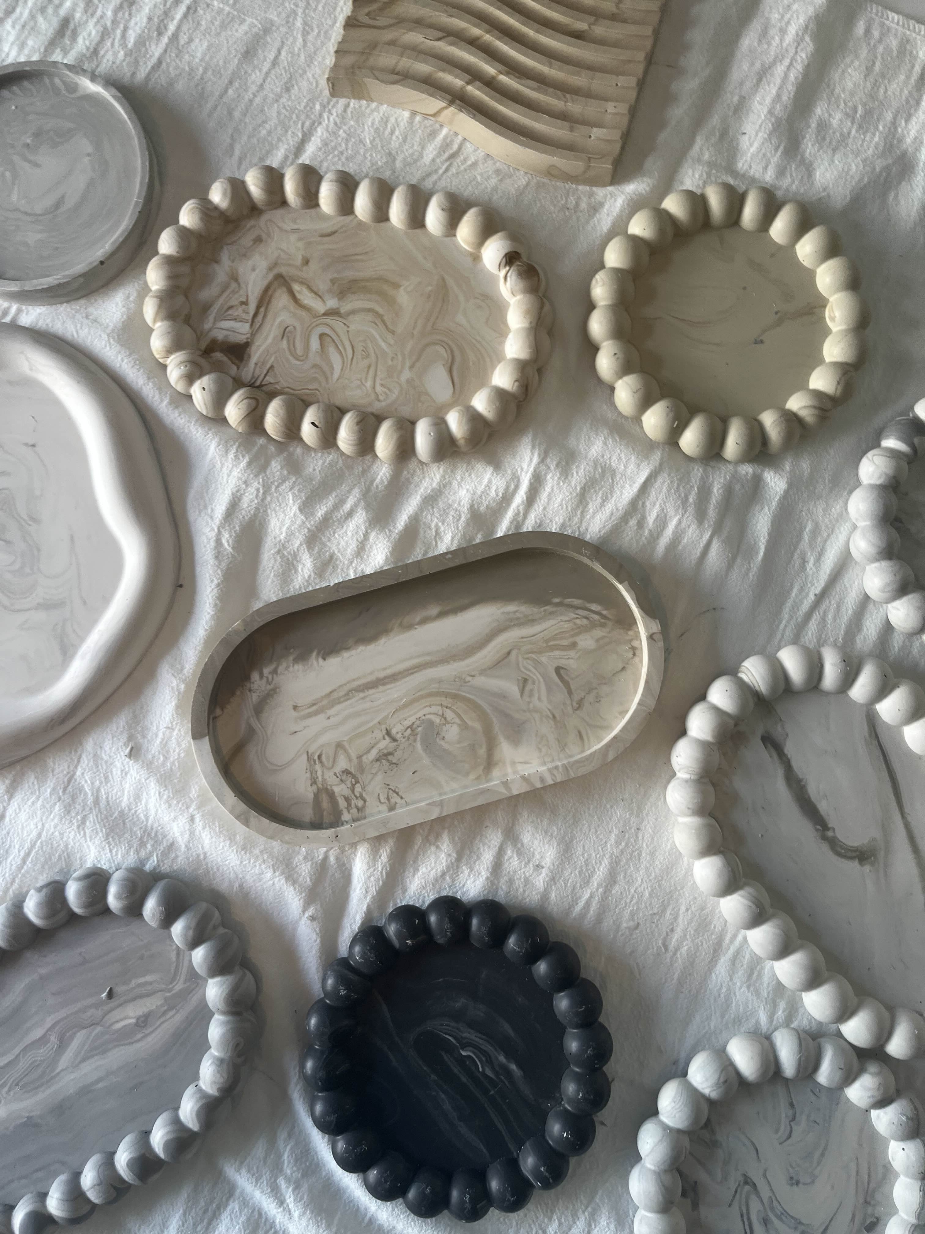 ジェスモナイトを使った作品は、やわらかなマーブル模様や繊細なフォルムが特徴で、どれもインテリアにさりげなく彩りを添えてくれます。トレイやオブジェとして使えば、空間にちょっとしたアートのようなアクセントが生まれ、日常が少し特別に感じられるはずです。
